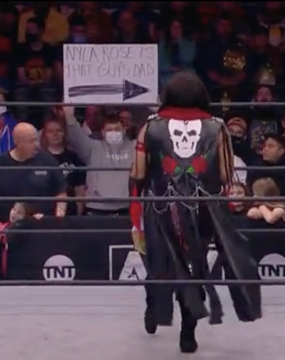 Es de saberse que Nyla Rose es una luchadora transgénero y se sintió ofendida ante el cartel, pues incluso le “sacó el dedo de en medio” al aficionado.