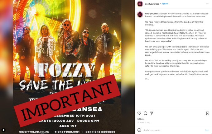 Así informaba @sincityswansea sobre este hecho: "Esta noche estamos devastados al saber que Fozzy tendrá que cancelar su cita prevista con nosotros en Swansea mañana. Hemos recibido un mensaje de la banda a las 9 pm de esta noche: 'Chris fue ingresado en el hospital por un problema de salud tratable y no relacionado con el Covid-19'. Lamentablemente, el espectáculo del viernes en Swansea se cancela y se reembolsarán todas las entradas".
