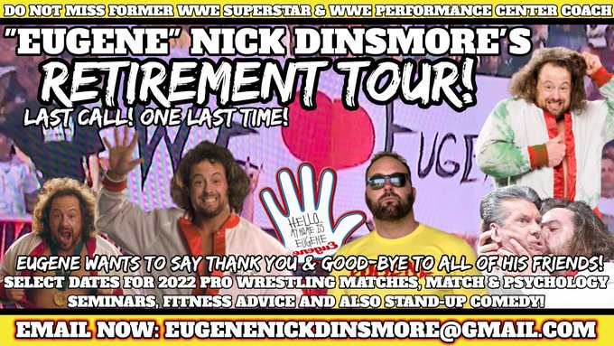 Nick Dinsmore, más conocido como Eugene, ha anunciado su gira de retiro. El luchador de 45 años ha publicado en su cuenta de Twitter que está abierto a fechas para tener sus últimas luchas.