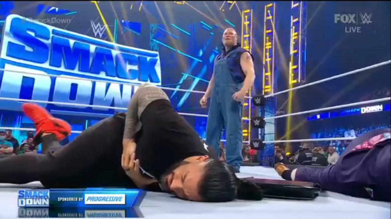 Sin embargo, Brock Lesnar apareció para evitarlo y de paso propinó una paliza a Jimmy y Jey Uso y un F5 a Reigns para poner punto y final a la emisión de SmackDown.