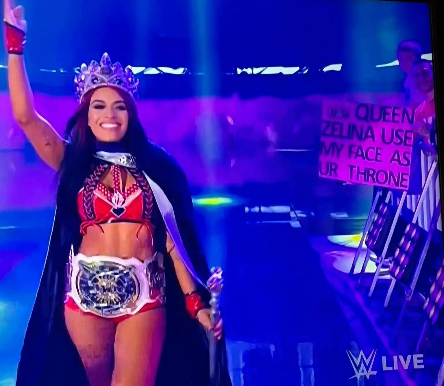 Mientras Zelina Vega iba haciendo su entrada justo cuando caminaba hacia el ring se pudo ver un fanático mostrando un cartel con un mensaje ofensivo escrito en él diciendo lo siguiente.
