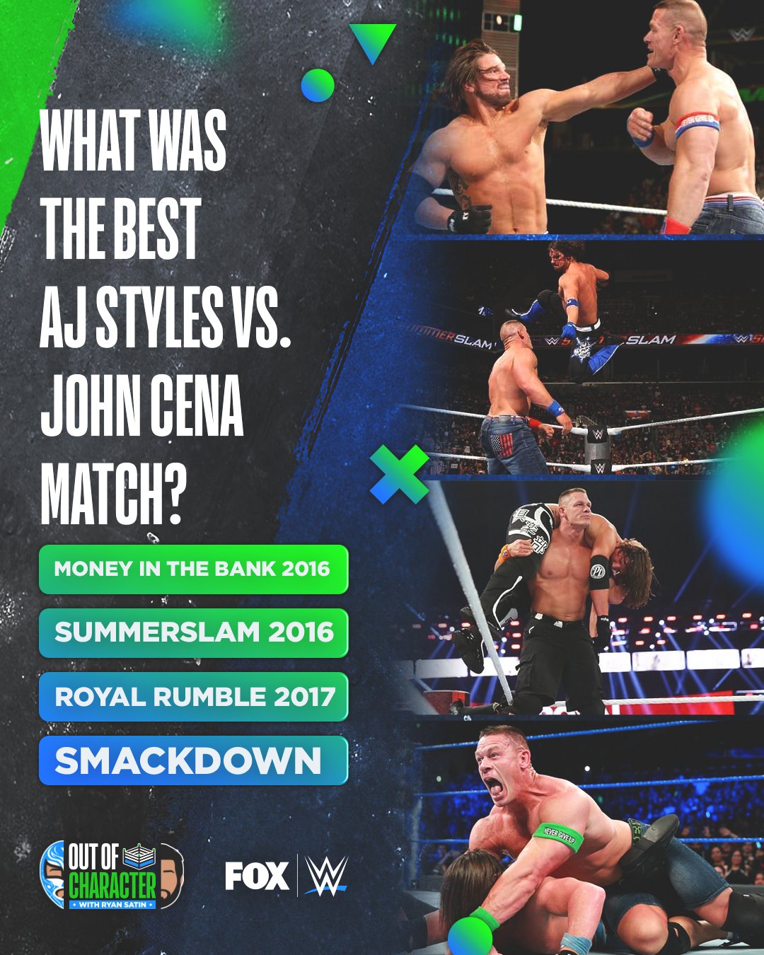 Tal vez el combate que tuve con John Cena en SummerSlam. El primero si Styles se refiere al de SummerSlam, realmente fue el segundo de la serie, pues el primero tuvo lugar en Money in the Bank.