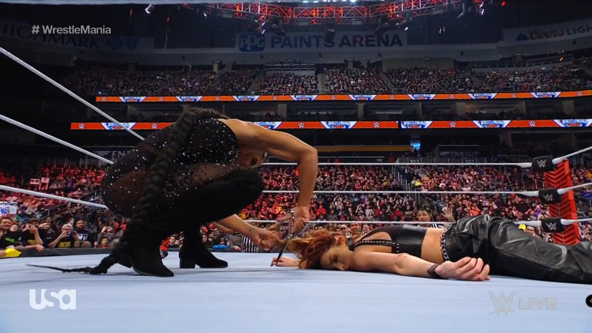 Bianca Belair le corta el pelo a Becky Lynch en WWE RAW previo a su combate en WrestleMania 38