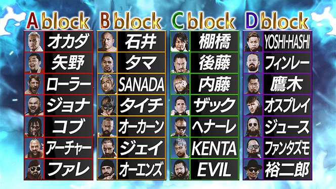 El torneo de este año tendrá cuatro bloques de siete participantes cada uno. Los ganadores de cada bloque pasarán a las semifinales el 17 de agosto, y la final tendrá lugar el 18 de agosto. Tanto las semifinales como la final tendrán lugar en el Budokan Hall. El año pasado, Kazuchika Okada venció a Kota Ibushi en la final. Okada repite en esta edición, pero Ibushi se ha quedado fuera debido a los problemas con la compañía que han tenido lugar en las últimas semanas.