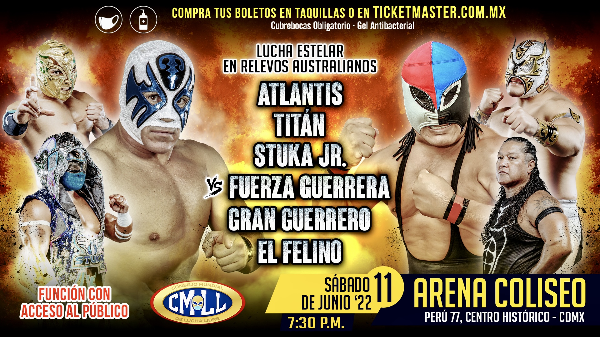 La empresa Consejo Mundial De Lucha Libre presentó una nueva edición de CMLL Sábado de Coliseo desde la Arena Coliseo de Ciudad de México. Este show tuvo como evento principal una por equipos entre Atlantis, Titán y Stuka Jr. contra Fuerza Guerrera, Gran Guerrero y El Felino. Sin mayor dilación, te presentamos los resultados CMLL Sábado de Coliseo 11 de junio de 2022.