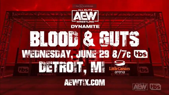 Según dio a conocer la propia All Elite Wrestling, realizarán por segundo año consecutivo un episodio de especial de AEW Dynamite denominado como Blood & Guts. Este episodio se llevará a cabo el próximo miércoles 29 de junio desde el Little Caesars Arena de Detroit, Michigan. Será el primer episodio de Dynamite tras Forbidden Door.