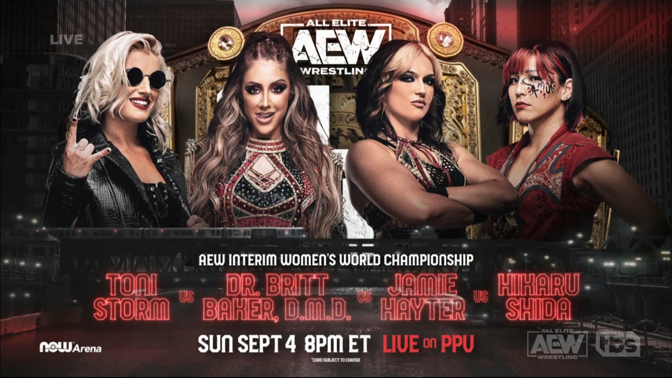 Durante las transmisiones de AEW Dynamite a través de TBS y Fite TV, se ha confirmado que Toni Storm, Jamie Hayter, Hikaru Shida y Britt Baker lucharán por el Campeonato de Mujeres interino en All Out 2022, el próximo pague-por-ver de All Elite Wrestling.