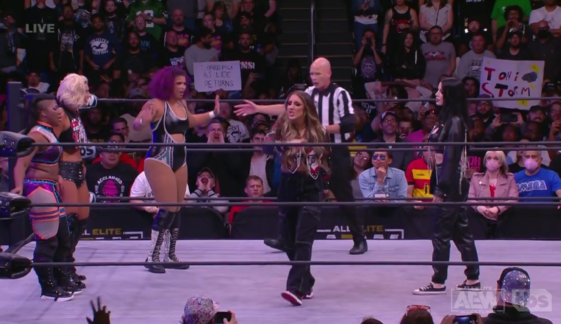 El episodio de esta semana en Washington vio a Willow Nightingale, Toni Storm y Athena derrotando a Penelope Ford, Serena Deeb y Jamie Hayter. Después del combate, las rudas empezaron una emboscada con Britt Baker a la cabeza. Sin embargo, esta última se llevó una gran sorpresa cuando Saraya empezó a aplicar ofensiva para defender a sus compañeras. "The Anti Diva" logró ahuyentar a las villanas ante un público sorprendido por lo ocurrido.