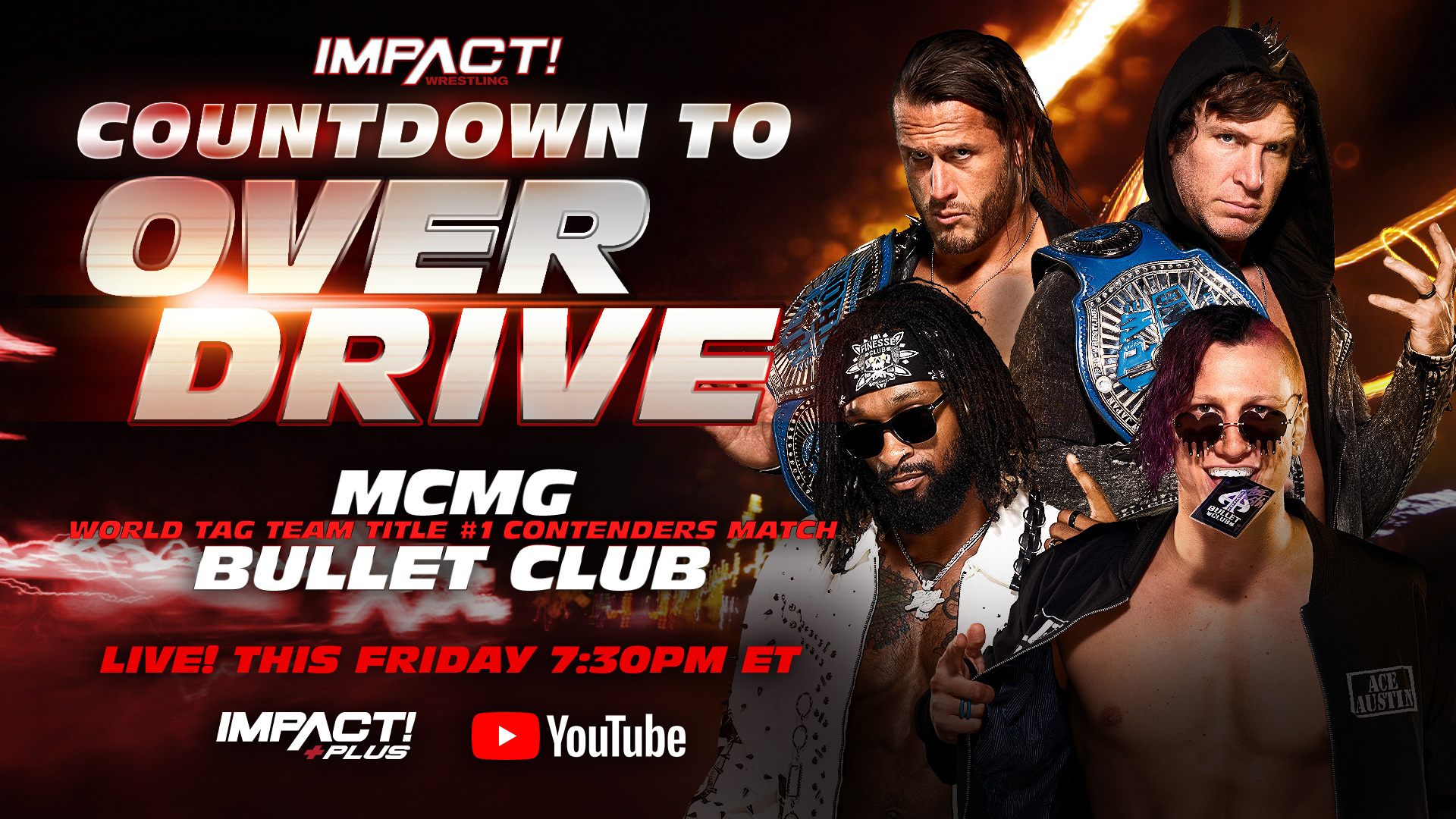 Según confirmó recientemente IMPACT Wrestling, The Motor City Machine Guns y Bullet Club lucharán por una oportunidad para ser los retadores de los Campeonatos Mundiales por Parejas de la promoción y habrá una ‘Six-Way Match’ entre Kenny King, Yuya Eumura, Bhupinder Gujjar, Jason Hotch, Mike Bailey y Rich Swann en Countdown To Over Drive 2022.