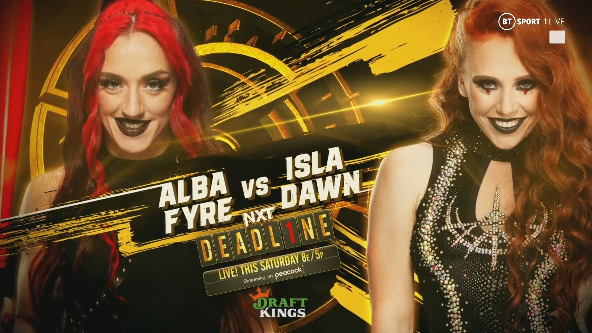 Durante las transmisiones de WWE NXT a través de USA Network, se ha confirmado que Alba Fyre luchará ante Isla Dawn en Deadline, el próximo Premium Live Event del territorio de desarrollo de la empresa.