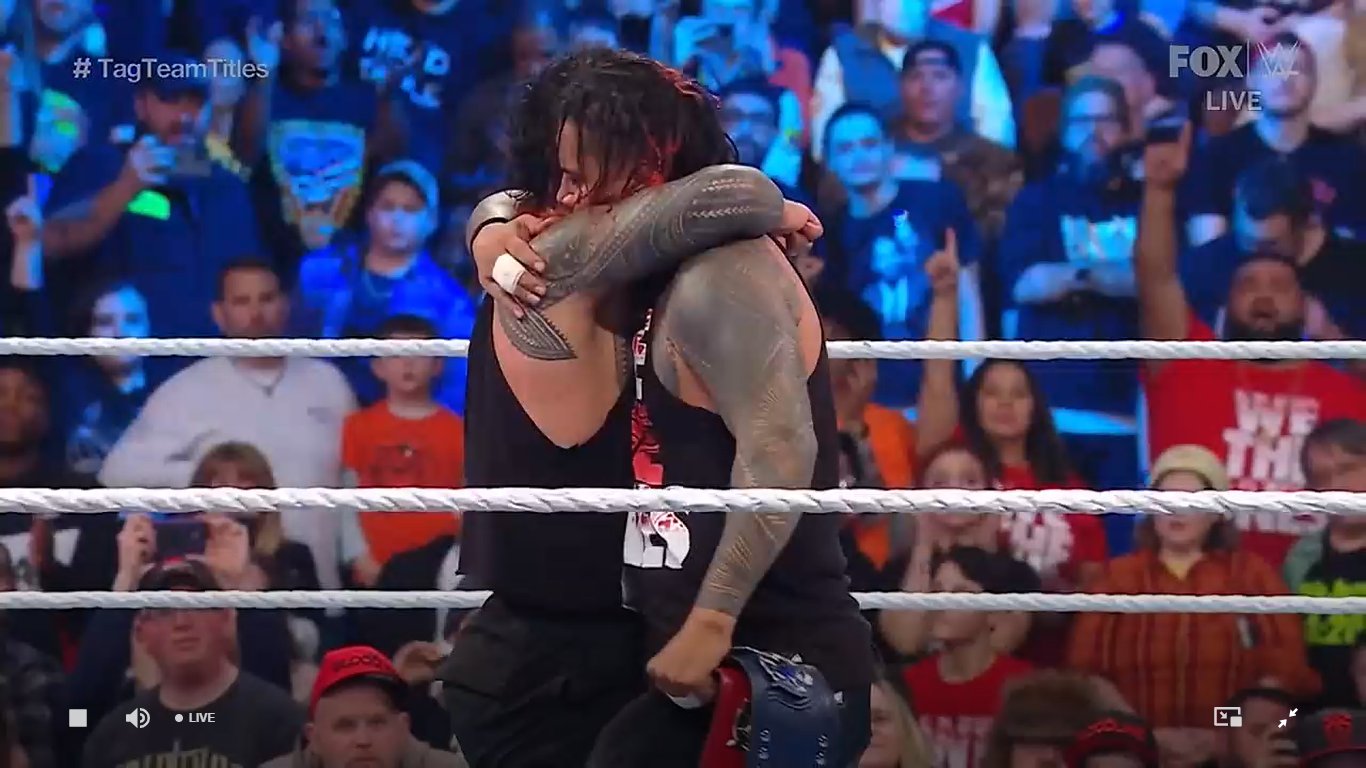 Justo antes de que toquen la campana, Jey Uso realizó su regreso para luchar junto a su hermano. Los primeros minutos de la contienda fueron disputados entre Jey y Ricochet, donde el campeón sacó una pequeña ventaja hasta que Braun Strowman ingresó. Después, Strowman aplicó un Running Powerslam y Ricochet un Shooting Star Press sobre Jimmy, pero su hermano llegó justo para salvarlo. Finalmente, Jey aplicó un Splash sobre ‘The One And Only’ para retener los títulos vía pinfall.