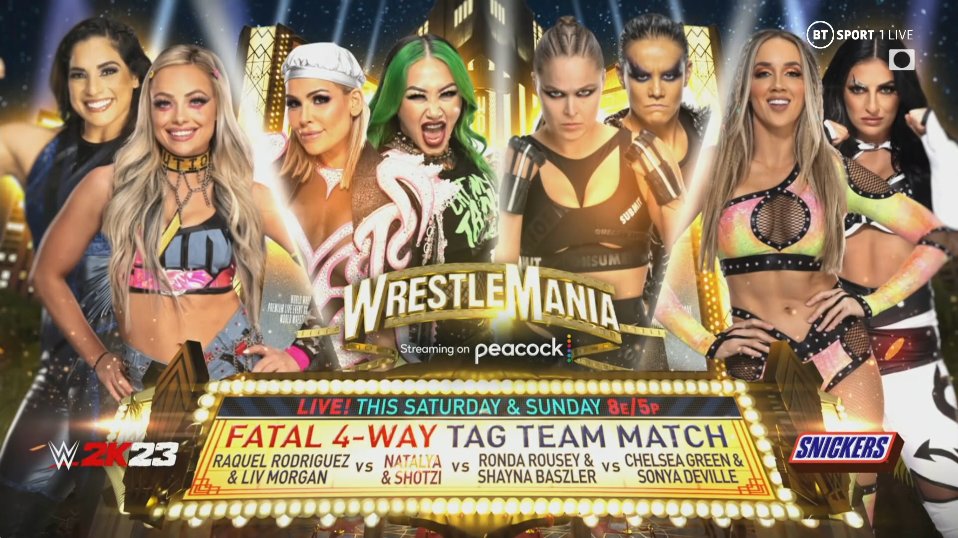 Chelsea Green y Sonya Deville se unen a Liv Morgan y Raquel Rodríguez, Natalya y Shotzi, y Ronda Rousey y Shayna Baszler para completar los cuatro equipos femeninos que se enfrentarán en la ‘Fatal 4-Way Match’ de WrestleMania 39. Hasta el momento, no se ha confirmado si el combate se llevará a cabo en la primera o segunda noche del espectáculo.