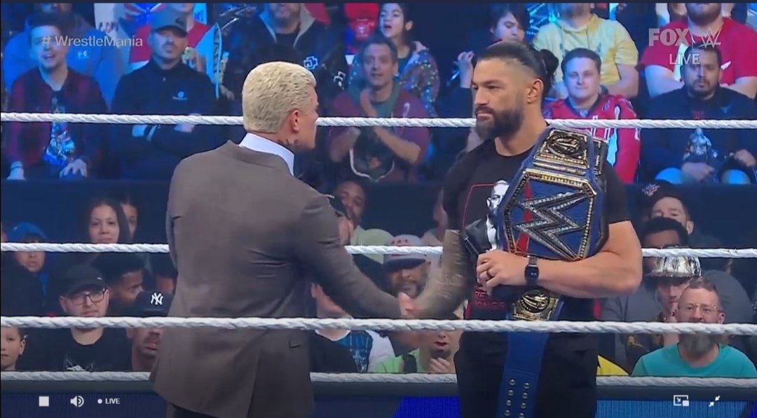 Durante el primer segmento de la última edición de Friday Night SmackDown, Roman Reigns y Cody Rhodes tuvieron su primer careo rumbo al evento principal de WrestleMania 39, en el que estará en juego el Campeonato Universal Indiscutido de WWE.