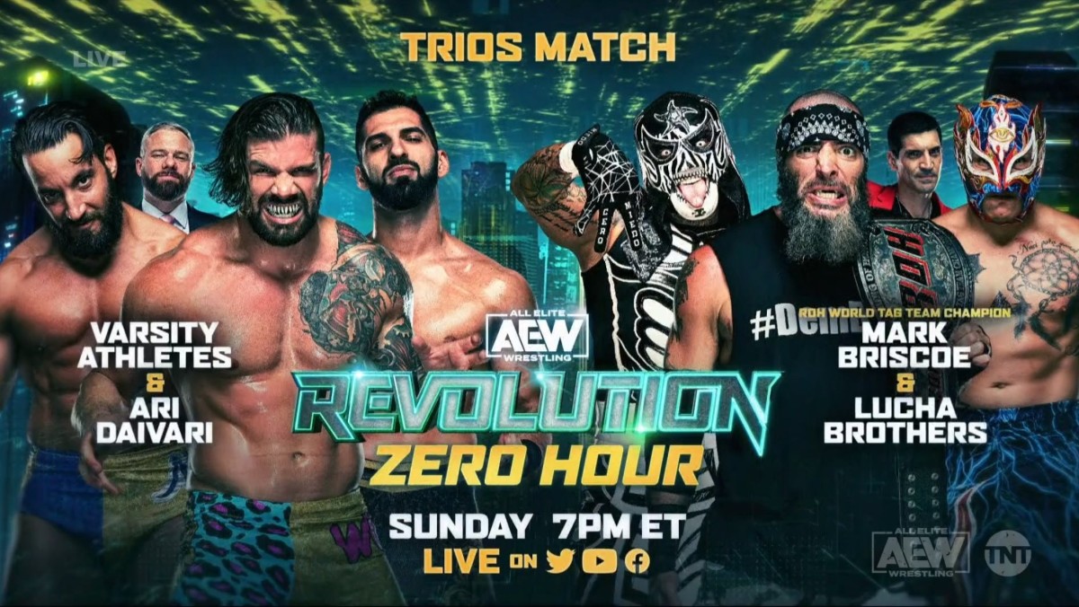 El próximo domingo 5 de marzo, All Elite Wrestling presentará su primer PPV del año, AEW Revolution, desde el Chase Center de San Francisco, California. Recientemente, se confirmó que The Varsity Athletes y Ari Daivari se enfrentarán a Mark Briscoe y The Lucha Brothers en la ‘Zero Hour’ de este show.