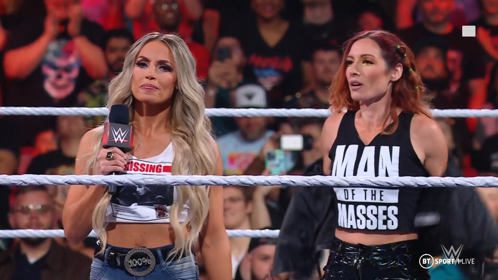 La música de entrada de The MAN sonó inmediatamente, pero se trató de un engaño de la integrante del WWE Hall of Fame hacia los fanáticos. En la segunda vez que se escuchó su tema en los altavoces, Becky apareció detrás de Trish y conectó un par de golpes de gracia para ahuyentarla del cuadrilátero. "The MAN ha regresado para patearte el trasero", dijo Lynch ante un público eufórico que deseaba verlas a ambas enfrentadas.