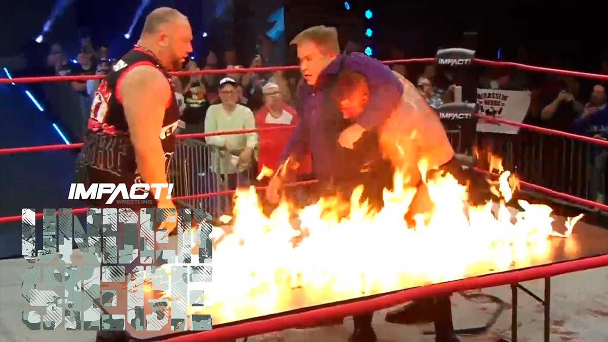 Scott D'Amore atraviesa una mesa en llamas en Impact Under Siege