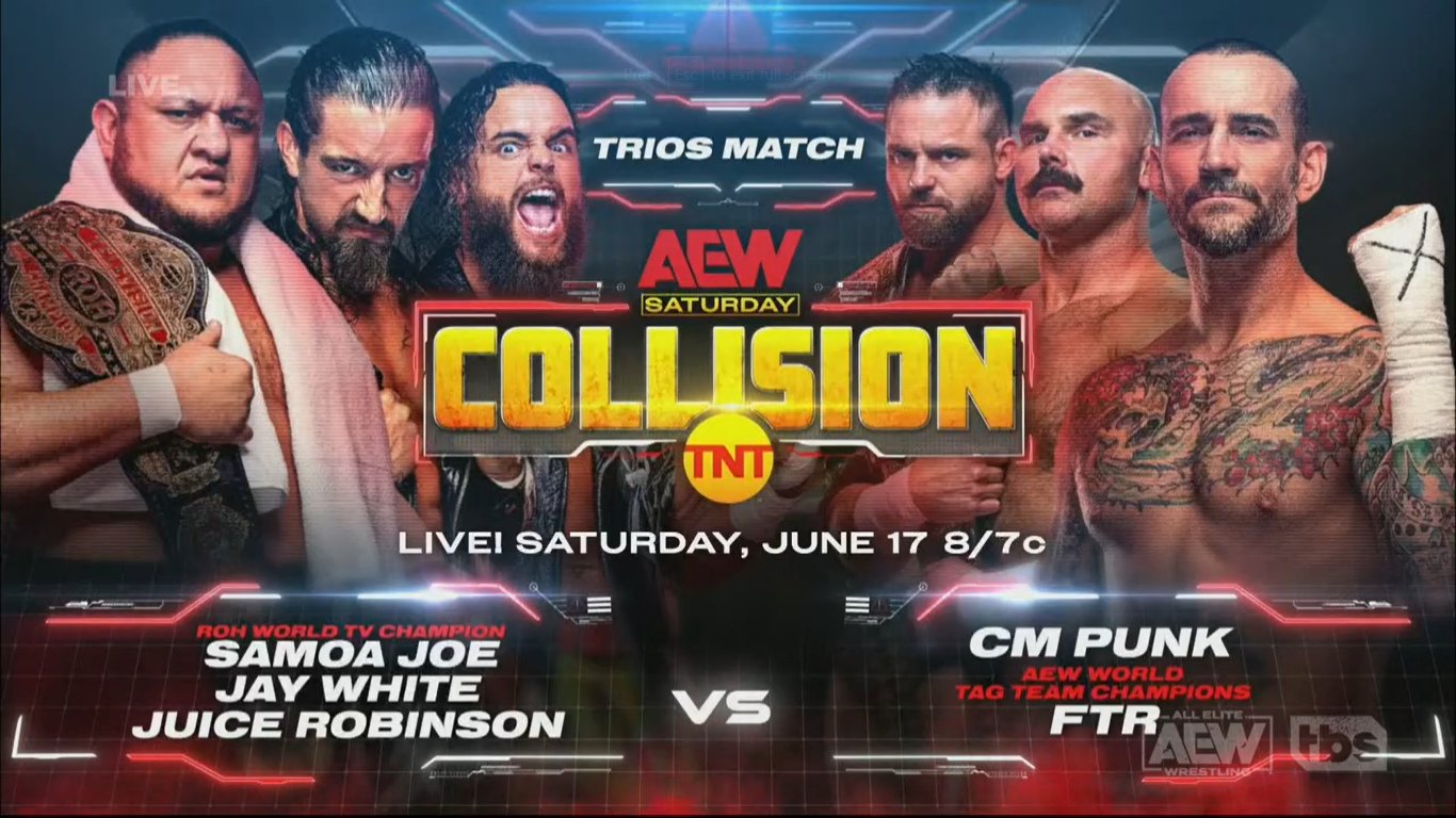 Durante AEW Dynamite, Tony Khan anunció que CM Punk se unirá a Cash Wheeler y Dax Harwood de FTR para enfrentarse a Samoa Joe, Juice Robinson y Jay White en un combate de tríos en el evento principal de Collision.