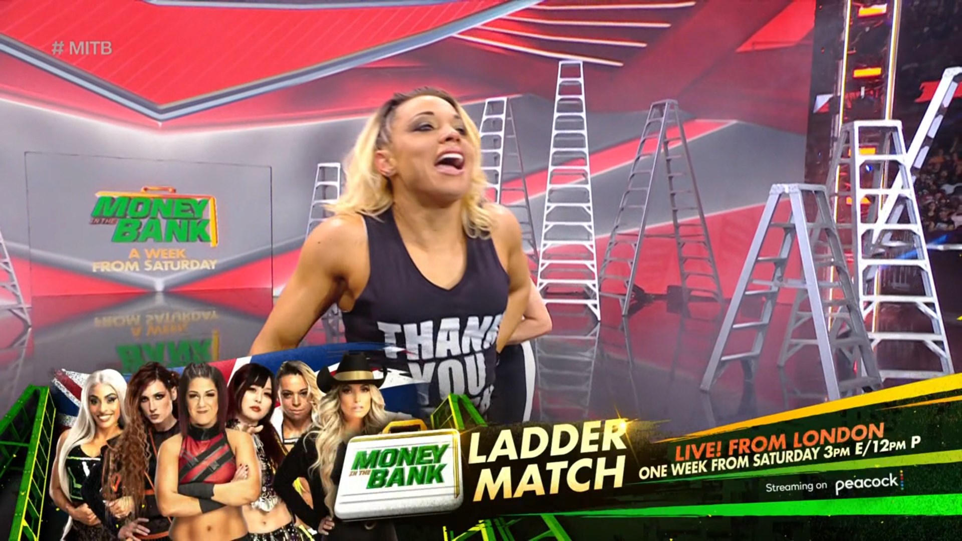 El episodio de esta semana en Cleveland, Ohio vio el último combate clasificatorio de las mujeres de RAW camino al evento en Londres. Trish Stratus se vio muy pareja ante Raquel Rodriguez por varios minutos hasta que Becky Lynch apareció para atacar a ambas mujeres. La descalificación favoreció a Stratus, quien se unirá a la lucha de escaleras que elegirá a la próxima "Ms. Money in the Bank". La ganadora obtendrá un contrato que podrá canjear por una lucha titular en cualquier momento y lugar durante el plazo de un año.