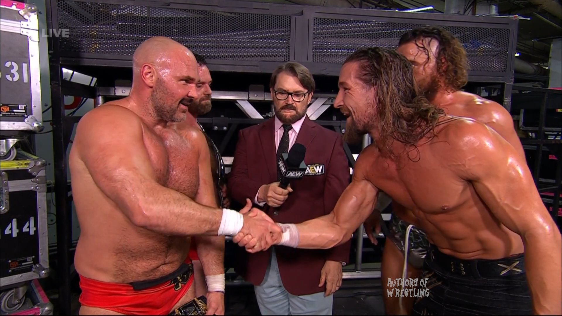 Minutos más tarde, los Campeones Mundiales por parejas de AEW fueron entrevistados en backstage. Jay White y Juice Robinson no tardaron en interrumpirlos, burlándose de FTR y autodeclarándose el mejor equipo después de haber derrotado a los mejores. White no quiso perder el tiempo y retó a FTR a un combate titular la próxima semana bajo la estipulación 2 out of 3 fall match (combate al mejor de 2 de tres caídas). Dash Harwood y Cash Wheeler aceptaron la propuesta y estrecharon las manos de sus retadores, quienes se marcharon del lugar muy confiados.